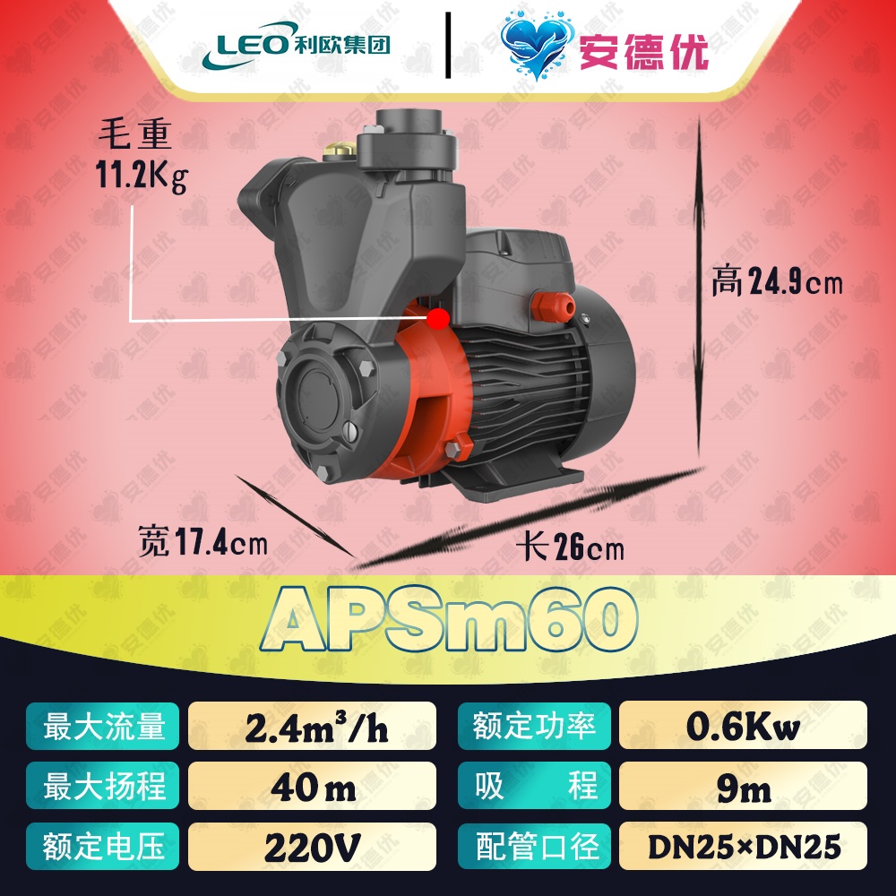 2.铜叶轮,APSm37、APSm60、APSm75配置不锈钢嵌件,APSm110配置铜嵌件;(能有效解决当水泵长期闲置重新启动时的叶轮卡住问题)