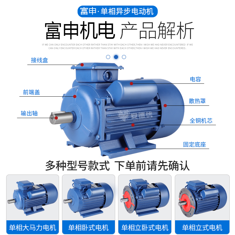 富申Y系列卧式电机是一款专为工业应用设计的单相220V交流电动机,采用优质材料和先进制造工艺,具有结构紧凑、运行稳定、维护简便等特点。该系列电机广泛应用于水泵、风机、压缩机、食品机械、包装机械等各种工业设备中,是中小功率机械设备的理想动力源。