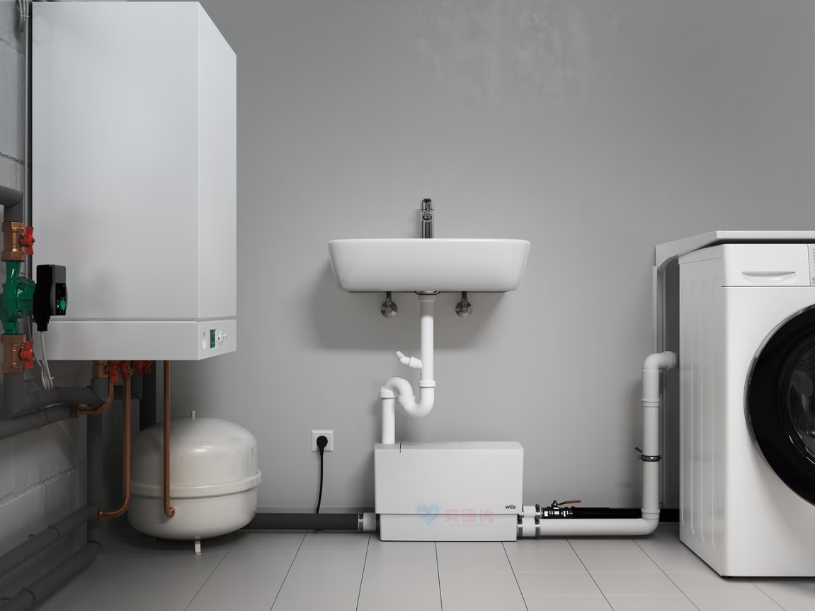 带警报触点的便捷提升系统,用于单个房间的污水排放,可以排放来自座便器、淋浴、洗碗机和洗衣机的污水,以及低于回流水位的冷凝式锅炉的冷凝水。