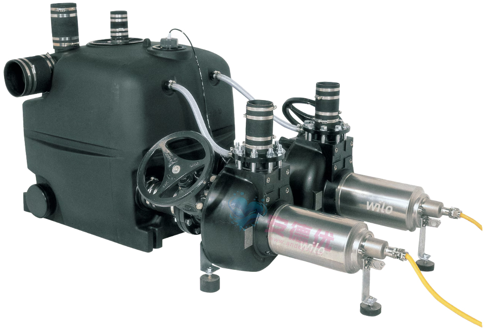 完全潜水式污水提升系统,即连即用(溢流高度:2 mWS,溢流时间:7 天),带有气密防水集水罐。配备 2 个 Wilo-Drain TP 80 或 TP 100 系列污水泵(材料:不锈钢和复合材料)。设备总重量低,易于操作,如采用 TP 80 水泵的双设备仅为 160 kg(最重的个体重量:水泵为 62 kg)。通过抽吸进行深层提取,可实现最佳的蓄水罐排水效果。